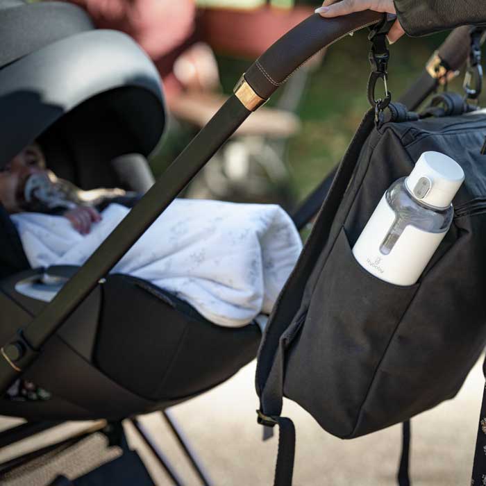 Nous avons décidé de créer un chauffe-biberon portable et sans fil qui vous accompagne partout. Grâce à sa batterie intégrée, le Chauffe-Biberon Nomad™ saura préparer votre lait à la température idéale dans n’importe quelle condition et dans n’importe quelle situation.